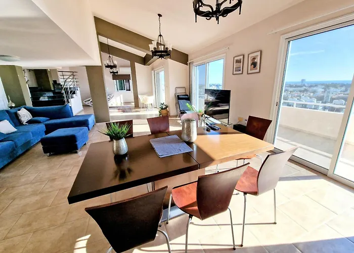Apartmán Paphos Central Penthouse poskytuje rovnou střechu k opalování, sluneční terasu a patio, a nachází se ve městě Paphos. Královské hrobky je vzdáleno 2 km, zatímco Paphos Archaeological Park lze zastihnout za 10 minut jízdy od apartmánu.